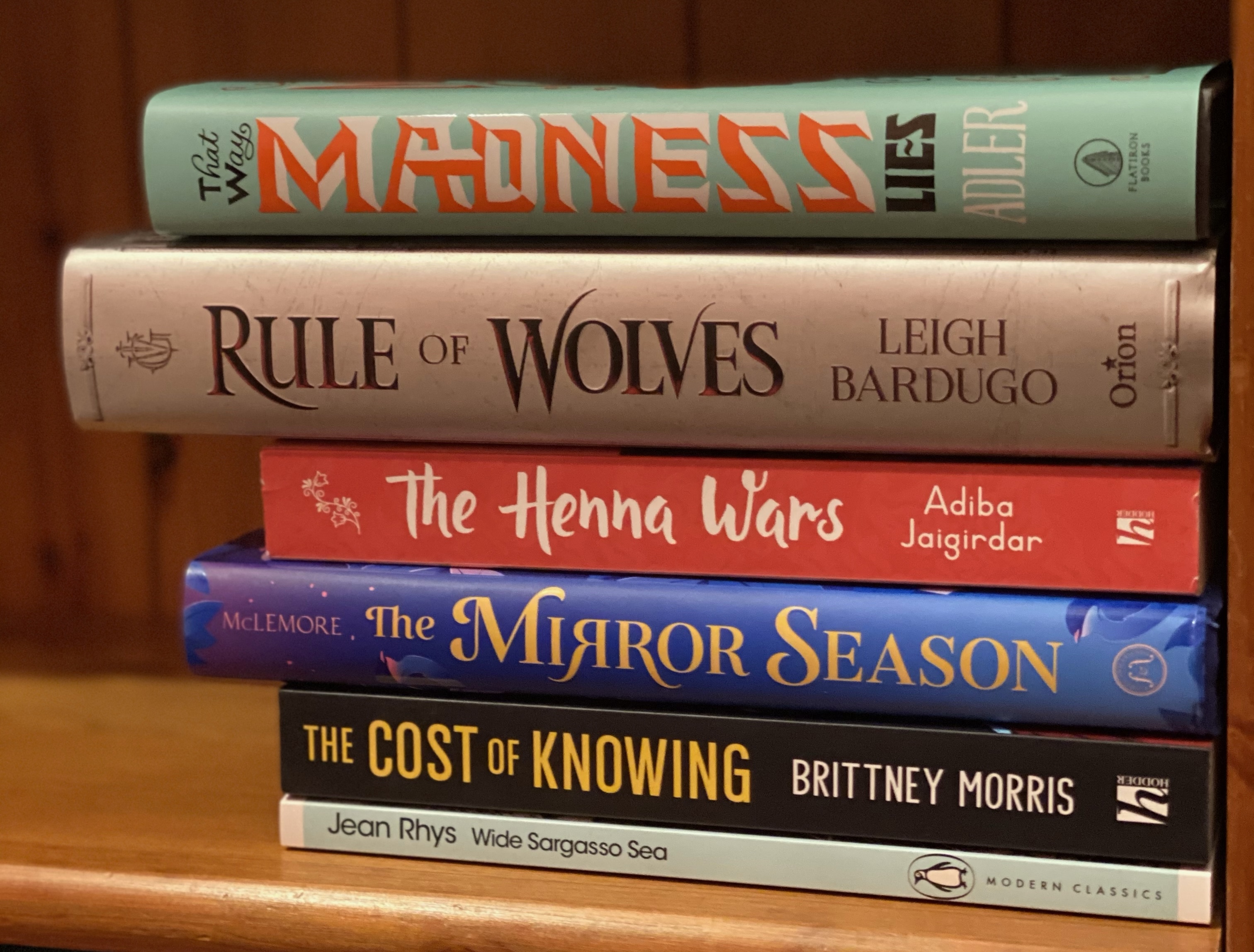 Next up, all the books in the photo on the right were either preorders or little treats for myself. This Rule of Wolves is my signed preorder, That Way Madness Lies and The Mirror Season were both preorders from Blackwells and I treated myself to the paperback of The Henna Wars from Round Table Books. The Cost of Knowing and Wide Sargasso Sea were books that I’d read previously and knew that I needed a physical copy to add to my shelf.
