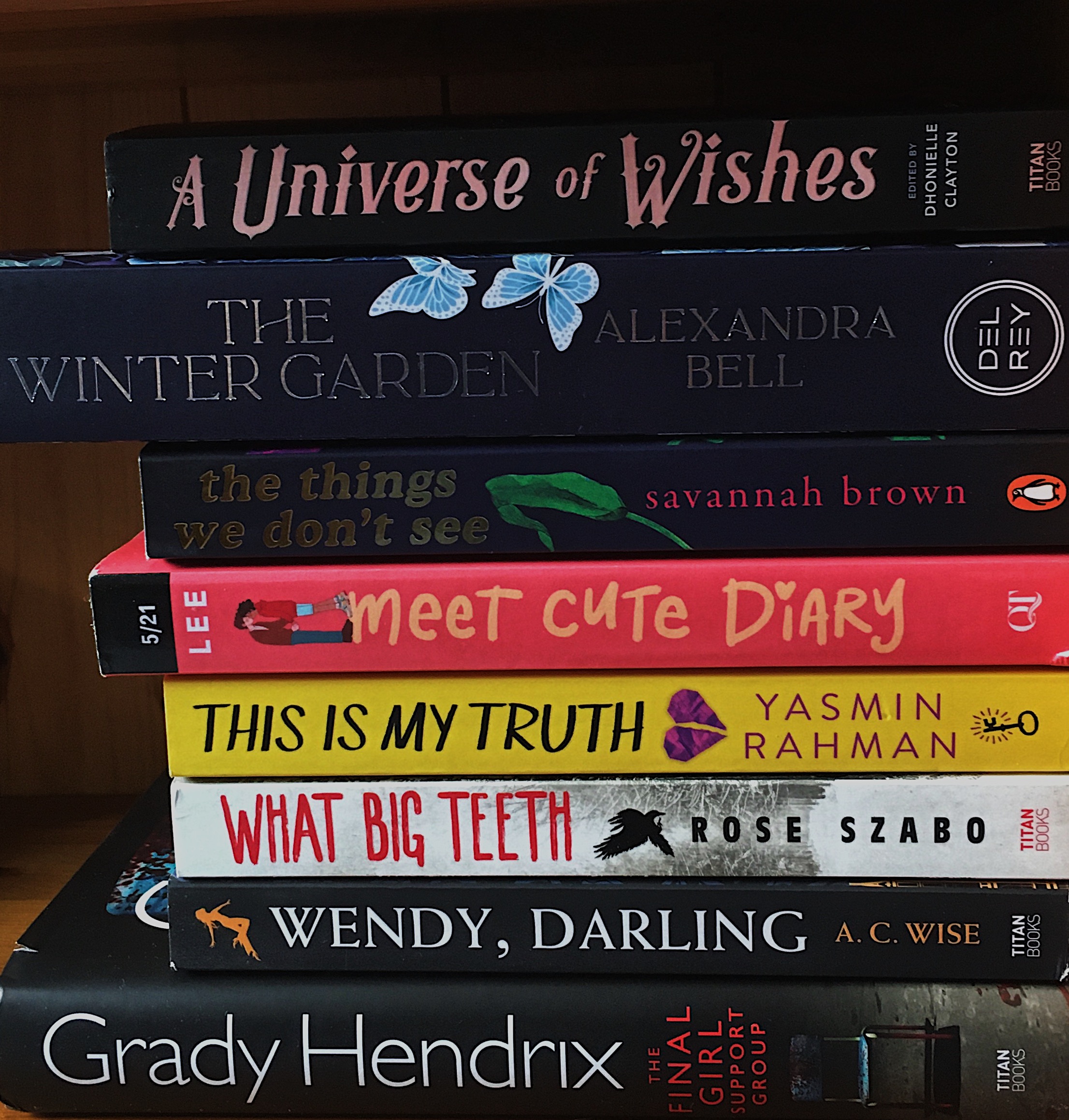 Firstly, the lovely Ellie at Titan sent me The Final Girl Support Group by Grady Hendrix, What Big Teeth by Rose Szabo, A Universe of Wishes and Wendy, Darling by A. C. Wise. Del Rey treated me to this gorgeous proof of The Winter Garden by Alexandra Bell and Penguin sent me The Things We Don’t See by Savannah Brown.