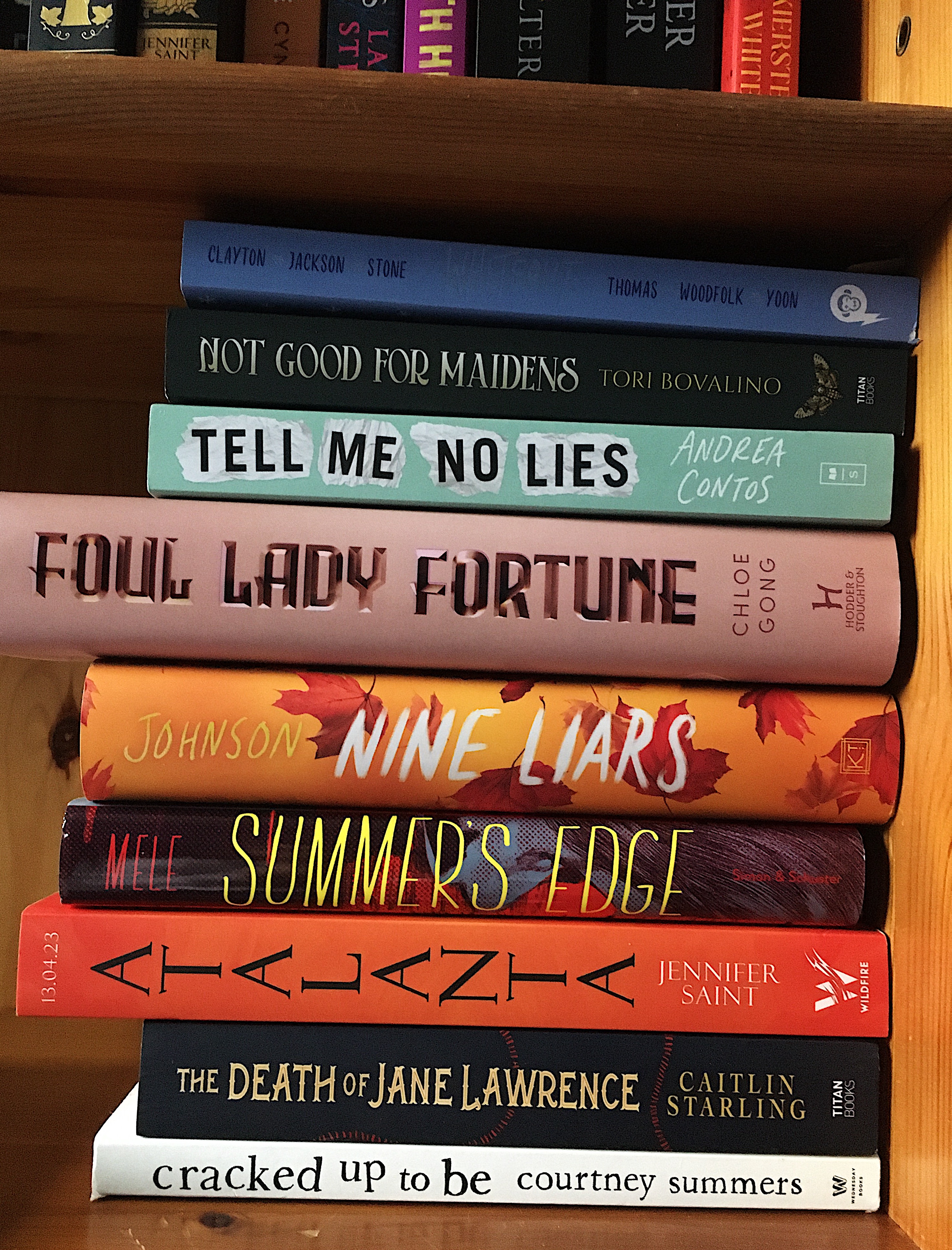 This month, I got a mega haul! The amazing team at Harper 360 sent me Nine Liars by Maureen Johnson and Titan sent me The Death of Jane Lawrence by Caitlin Starling. Over at Headline, the lovely Caitlin Raynor sent me Atalanta by Jennifer Saint, while the always fantastic Kiran Khanom at Scholastic Tell Me No Lies by Andrea Contos. Also, the team at Del Rey UK sent me this beautiful ARC of Nocturne by Alyssa Wees.