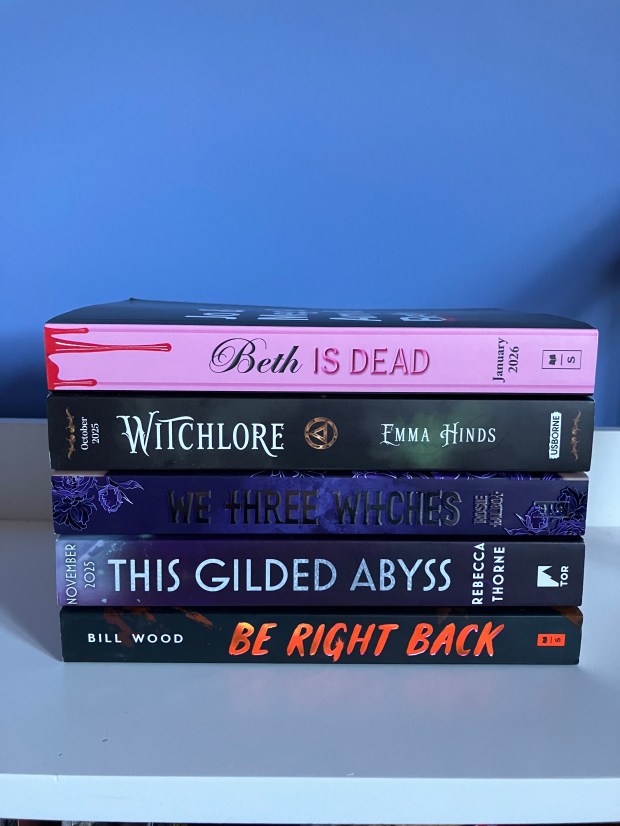 Scholastic thoroughly spoilt me by sending me Beth is Dead by Katie Bernet, We Three Witches by Rosie Talbot and Be Right Back by Bill Wood. Also, Tor UK kindly sent me This Gilded Abyss by Rebecca Thorne and Usborne sent me Witchlore by Emma Hinds.