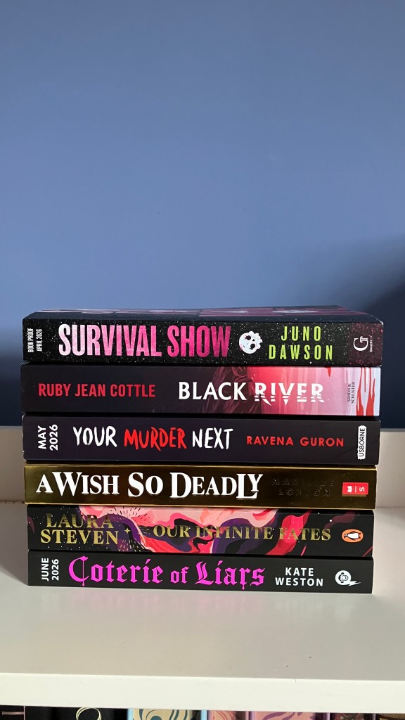 The amazing team at SimonYA sent me Survival Show by Juno Dawson and surprised me with Black River by Ruby Jean Cotte. Usborne kindly sent me Your Murder Next by Ravena Guron, while Scholastic surprised me with A Wish So Deadly by Marilize Loxton.